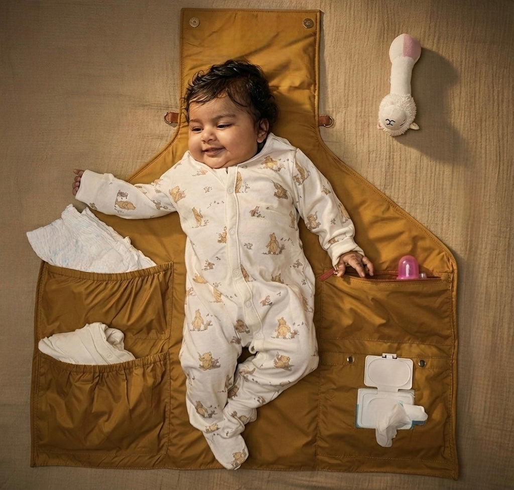 Yes. Portia is designed for real Indian parenting scenarios — weddings, parties, malls, airports, restaurants, parks, and long drives. The waterproof hypoallergenic lining wipes clean in seconds, making it the ideal portable diaper changing station for travel, day trips, and everyday use.